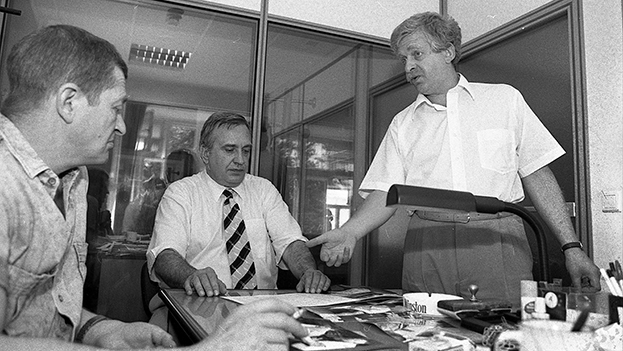 Дизайнер Александр Гланц, Владимир Кучмий и Владимир Гескин в 1996 году
