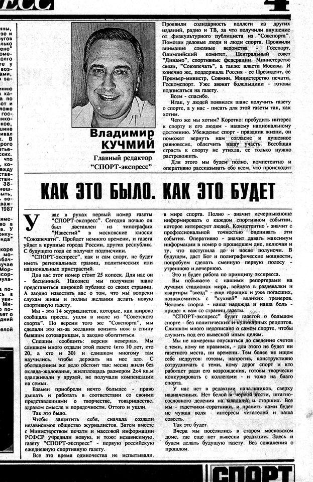 — Да, на кухне у Владимира Михайловича. Но начну с того, отчего вообще появилась идея «Спорт-Экспресса». Летом 1991 года я вернулся из командировки в Финляндии. Кучмий позвал меня к себе в кабинет и спросил о ближайших планах. Работа в «Советском спорте» и сама эта газета в том виде, в котором она выходила, на тот момент меня не радовали. Потому что даже в далекие времена люди имели возможность прочитать после тура все отчеты с составами, голами, наказаниями, количеством зрителей, погодой и т.д. И вдруг «Советский спорт» пришел к тому, что в номер шло два коротеньких отчета, а внизу — лишь результаты остальных матчей без подробностей. Меня такое положение дел не устраивало.